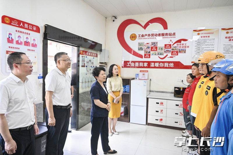 工会驿站(天心区环宇城站)全天候为外卖员、快递员等户外劳动者提供休憩减压、生活补给、心理咨询、法律援助等服务。吴桂英来到这里,与外卖员、快递员亲切交流。她说,炎炎烈日下,广大外卖员、快递员迎着灼人热浪,穿梭在大街小巷,为保障城市有序运转和群众幸福生活默默奉献。希望大家加强自我防护意识,做好防暑措施,注重劳逸结合,注意保重身体。
