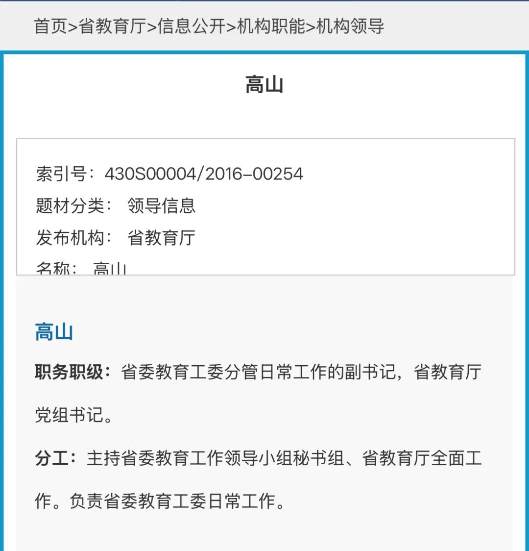 日前更新的湖南省教育厅官网显示,高山已任省委教育工委分管日常工作的副书记,省教育厅党组书记。