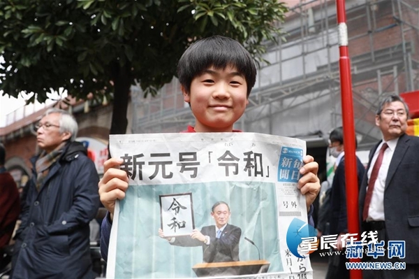 4月1日,在日本东京,一名小朋友展示自己拿到的当日号外报纸,报纸头版头条公布日本新年号为“令和”。新华社记者 杜潇逸 摄