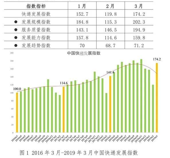 4月4日,国家邮政局发布《2019年3月中国快递发展指数报告》,经测算,2019年3月中国快递发展指数为174.2,同比提高22.2%。