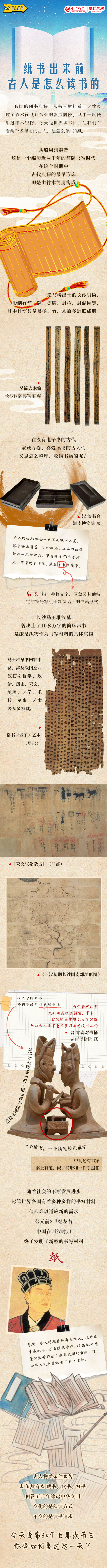 我国的图书典籍,从书写材料看,大致经过了竹木简牍到纸张的发展阶段,其中一度使用过缣帛织物。今天是世界读书日,让我们看看两千多年前的古人,是怎么读书的吧!