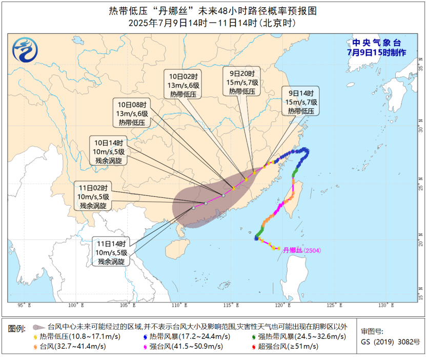今年第4号台风“丹娜丝”先后三次登陆我国,9日9时在福建宁德屏南县境内减弱为热带低压,其残余环流未来将长时间维持并向西南方向移动。受“丹娜丝”残余环流和西南季风的共同影响,9日下午至12日,福建、江西、湖南、广东、广西、贵州等地将有强降雨出现,福建东部局地累计降雨量可达600毫米以上,请公众警惕降雨可能引发的次生灾害。