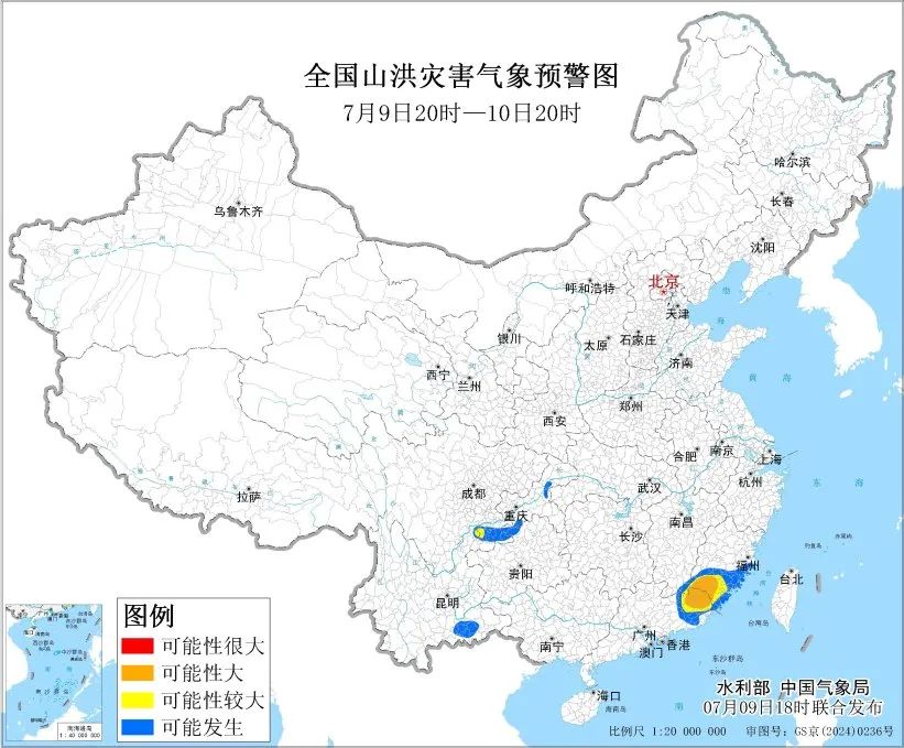 预计,7月9日20时至10日20时,福建南部、江西东南部、广东东部、四川东南部、云南东北部等地部分地区发生山洪灾害可能性较大(黄色预警),其中,福建南部、江西东南部、广东东部等地部分地区发生山洪灾害可能性大(橙色预警)。其他地区也可能因局地短历时强降水引发山洪灾害,请各地注意做好实时监测、防汛预警和转移避险等防范工作。