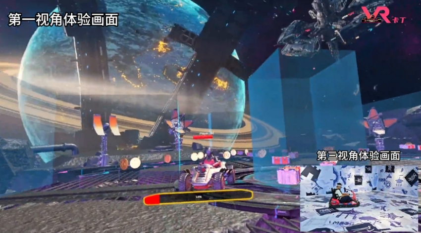 在传统卡丁车的基础上,戴上头显“跑酷”,穿上体感背心,通过振动感受“中弹”,一键“穿越”到不同的虚拟赛道,同时还能实现多人在线竞技。车机与游戏引擎深度融合,能实现精准的震动控制,模拟各类路况,同时模拟各类受击体感。