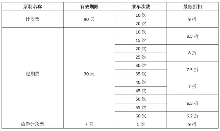 新型票制形成“多频次多让利”的梯度体系。对比传统单次购票,计次票中“10次/90天”“20次/90天”产品均可享9折优惠,计次票可提前预约10个行程;定期票有11个频次档位,其中“60次/30日”折扣低至6.2折,频次越高优惠幅度越大。