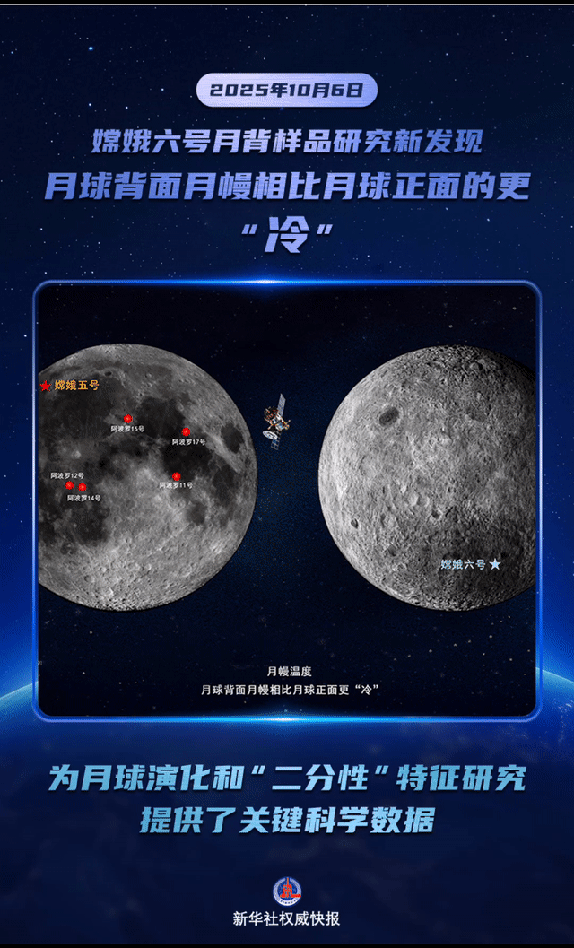 星辰在线10月6日讯 据新华社消息:10月6日,时值中秋佳节,国家航天局和国家原子能机构联合发布嫦娥六号月球背面样品研究最新成果。我国科学家首次基于嫦娥六号月球背面样品(月壤)研究发现,月球背面月幔相比月球正面的更“冷”。