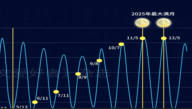 11月5日21时19分前后,月亮呈现出最完满的圆形,9个小时后,也就是11月6日6时27分,月球过近地点,距离地球约35.7万公里,这是2025年所有满月中与地球最近的一次。因此,11月5日晚上的这轮月亮将是今年的最大满月,俗称“超级月亮”。
