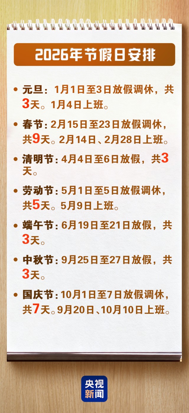 二、春节:2月15日(农历腊月二十八、周日)至23日(农历正月初七、周一)放假调休,共9天。2月14日(周六)、2月28日(周六)上班。