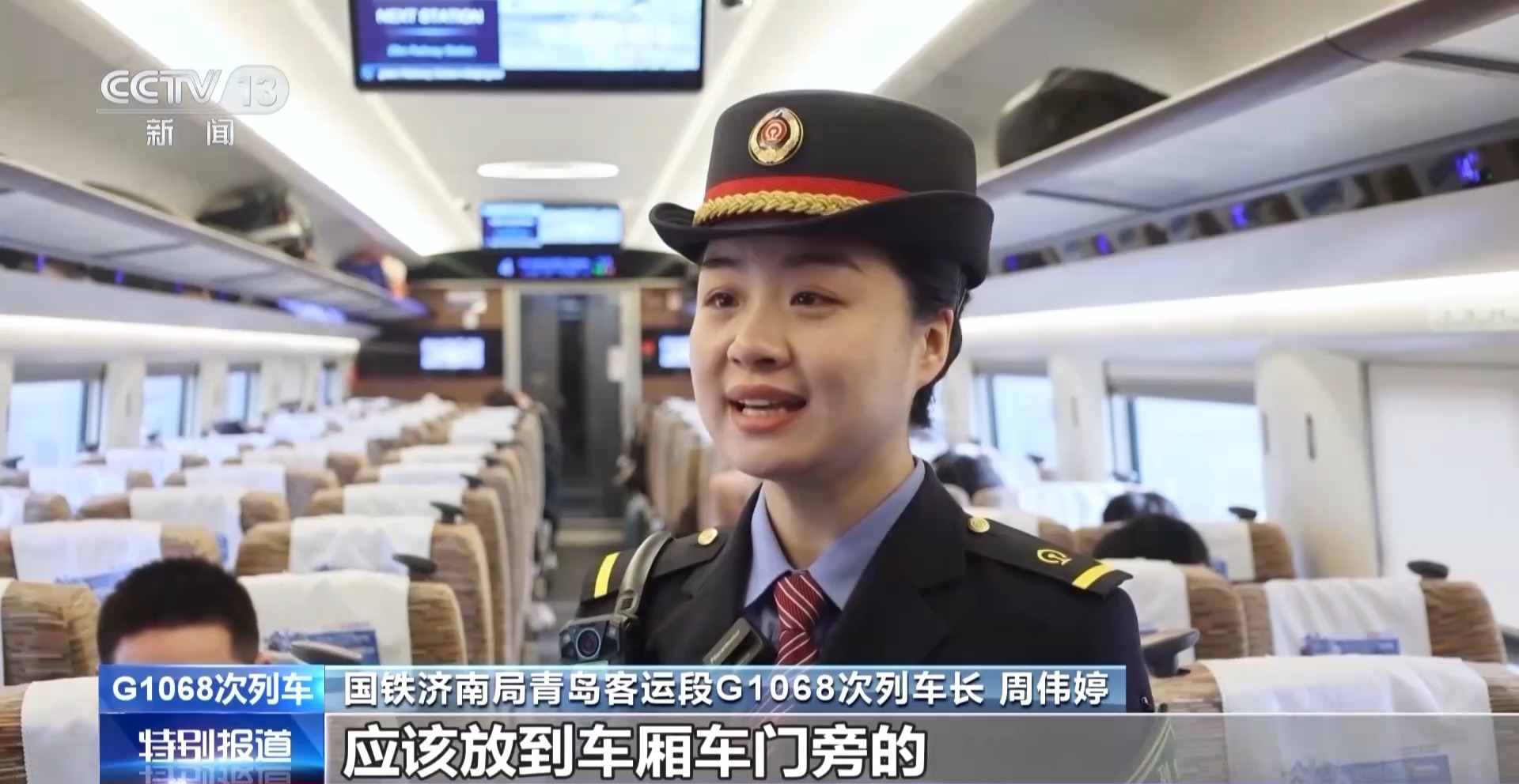 国铁济南局青岛客运段G1068次列车长 周伟婷:大件行李、婴儿车、轮椅等应该放到车厢车门旁的大件行李存放区、轮椅专区,或是车厢最后一排后方,不能占用席位、堵塞通道。平衡车、滑行器等轮式代步工具须使用硬质包装物妥善包装。