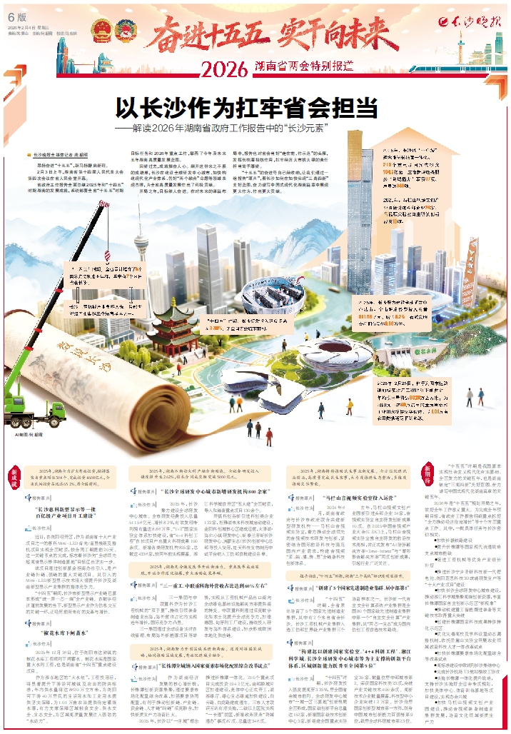 2026年是“十五五”规划开局之年,做好全年工作意义重大。为完成全年预期目标,省政府工作报告明确重点抓好“全力推动经济稳定增长”等十个方面重点工作。其中,一批具体任务与长沙密切相关: