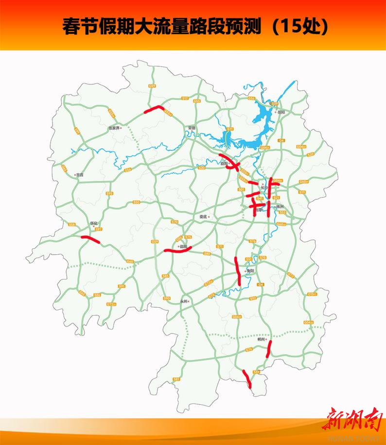 假期省内大流量路段预测有15处,主要集中在G5513长张高速长沙段、益阳段、张家界段;G4京港澳高速长沙段、湘潭段、郴州段;G60沪昆高速湘潭段、邵阳段、怀化段;G0421许广高速湘潭段、衡阳段、郴州段;G6021杭长高速长沙段;S20平洞高速益阳段;S50长芷高速长沙段。