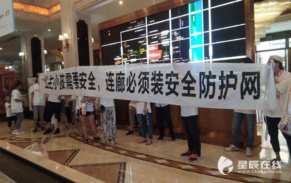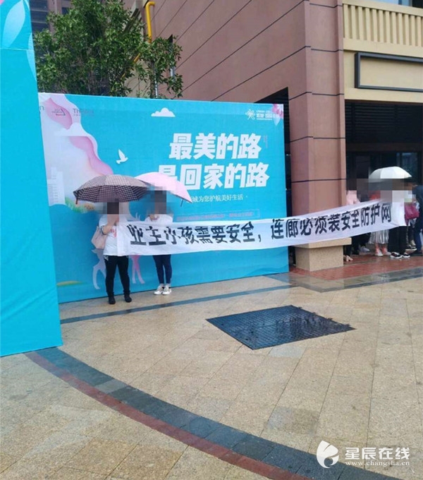(业主多次拉横幅维权,希望引起开发商对连廊安全问题的重视。)
