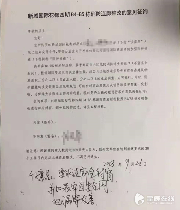因业主反映强烈,目前针对连廊较长的B4、B5栋,开发商正在进一步征求业主的意见,并下发了“关于新城国际花都四期B4—B5栋消防连廊整改的意见征询”。其中提到:将对连廊进行“部分封窗、部分拉网”改造。但根据物业管理条例等相关规定,对小区公共区域改造,需经专有部分占建筑物总面积三分之二且占总人数三分之二以上的业主同意才可实施。