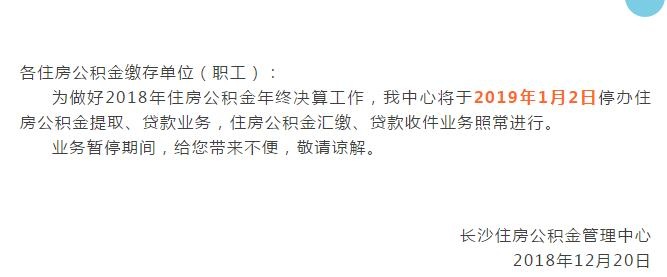 星辰在线12月20日讯 12月20日,长沙住房公积金发布《关于年终关账的通知》,2019年1月2日起,长沙住房公积金管理中心停办住房公积金提取、贷款业务,住房公积金汇缴、贷款收件业务照常进行。