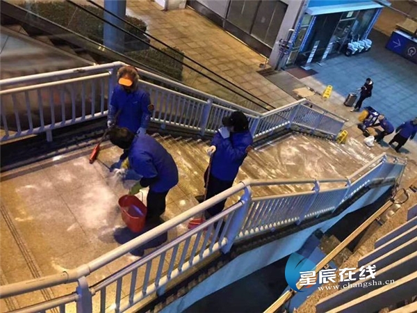 (轨道物业安保队伍对西广场进行撒盐防冻作业。)