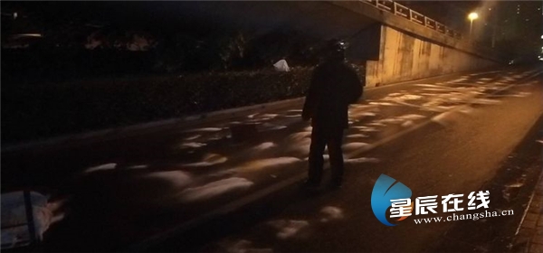 在人行通道铺设的防滑麻袋上撒盐,防止再次结冰