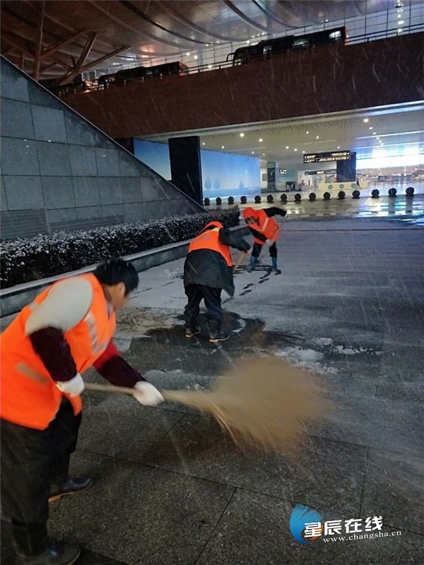 (玉诚物业安排人员对东广场旅客通行区积雪进行清理。)