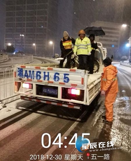 (凌晨对辖区五一路湘江大道匝道进行撒盐除冰。)