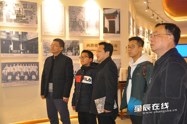 (雅礼中学校长刘维朝(中)、雅礼校友会会长张应明(右一)与两位校友一同参观校史馆。)