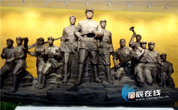 首先见到的是反映平江起义壮阔场面的巨型英雄群雕。正中昂首挺胸、威武不屈的,那是我们敬爱的彭德怀同志!他右手插腰,腰间挎着手枪,左手横于胸前,紧握望远镜,目光镇定,凝视着远方。他的左右两侧,十一名英勇的战士,有人在吹军号,有人手指前方,有人跨步腾跃,构成一幅震撼人心的历史图画。