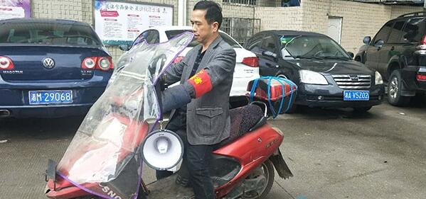 (周栋梁每天骑着电瓶车,用“小喇叭”提醒居民重视安全,图片由通讯员提供)