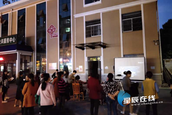 (星沙街道安监中心组织星城社区湘当安全公司在社区门口播放安全宣传电影。)
