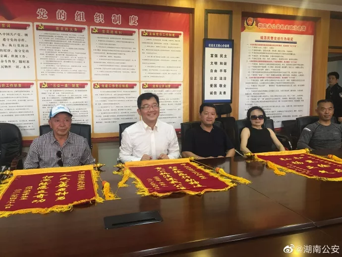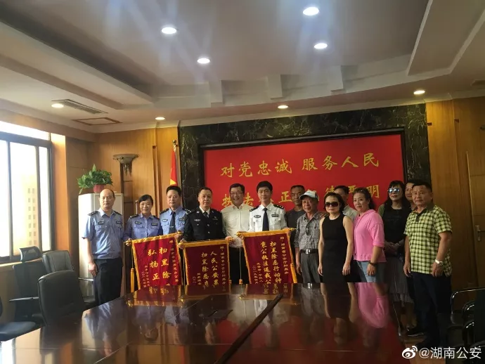 昨日下午,同升湖山庄小区业委会成员、湖南本土相声演员大兵及部分小区业主代表,来到湖南省公安厅赠送3面锦旗,感谢公安机关扫黑除恶,匡扶正义。