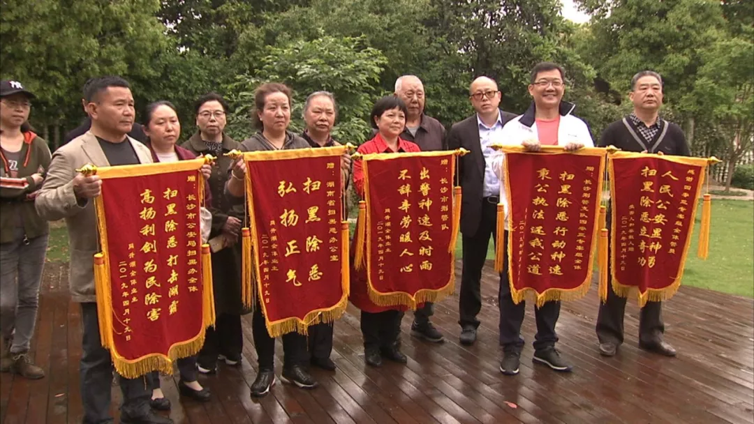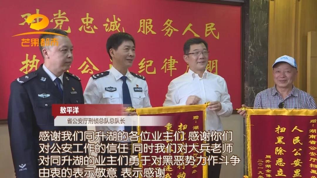 接过锦旗,湖南省公安厅刑侦总队总队长敖平洋说:“感谢各位业主对公安工作的信任,也感谢你们对公安工作,特别是扫黑除恶行动送来的锦旗。