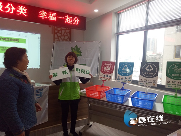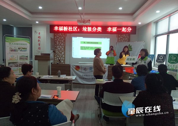 星辰在线4月28日讯(通讯员 杨甜)为深入开展垃圾分类的宣传教育工作,努力提高社区居民的环保意识和改善环境的积极性,4月28日上午,开福区幸福桥社区联合长沙市绿动环保服务中心在社区四楼会议室开展“垃圾分类 幸福一起分”环保主题活动。社区工作人员、辖区党员、居民楼栋长以及志愿者共60余人参与活动。