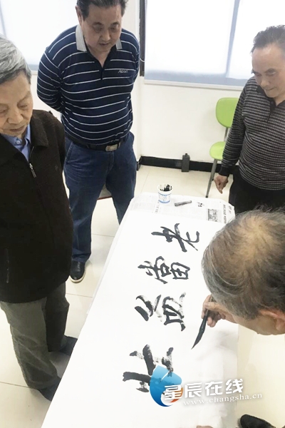 (5月10日下午,长沙市开福区清水塘街道四季花城社区举办书法创作交流笔会活动。)