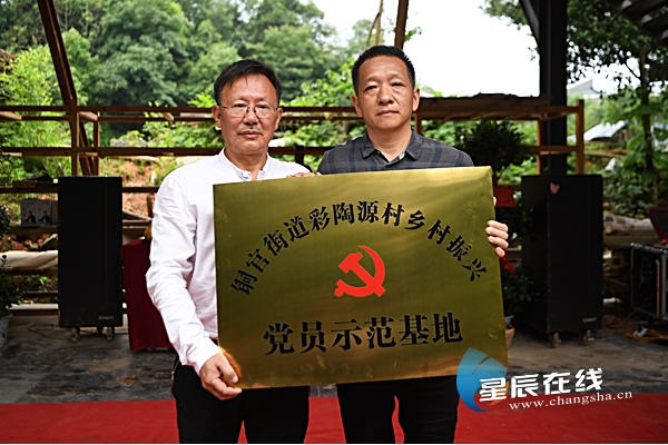 (彩陶源村支两委书记周新国<右>与铜官窑上人工作室负责人吴小平<左>为彩陶源村乡村振兴党员示范基地授牌。)