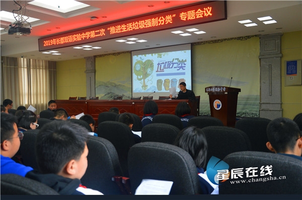 通过班会或者微宣讲的方式让垃圾分类成为校园新时尚,是长郡双语实验中学的一项创新工作。2018年起,长郡双语实验中学系统地全面推进实施生活垃圾强制分类工作,在营造宣传氛围、普及分类知识、开展实践活动、配齐设施设备、抓实日常管理、建立回收机制等多方面开展的相关工作,让垃圾分类成为师生的共识共为。