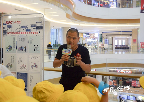“我们唱的歌还能画成画?!”看到蔡颖强的童谣画作,6岁的蕾蕾宛如发现了新大陆。“在孩子的成长中,家乡童谣不应该缺席,而应该得到更多的重视和保护。”蔡老师走街串巷5年,收集汇总130多首长沙童谣,“长沙童谣不仅仅是长沙的,是中国的,更是世界的!我小时候对童谣特别有亲切感,我希望用画画,能让孩子更直观地了解这些东西,让童谣更好地得到传承和保护。”在现场,蔡老师为孩子们讲述了《月亮粑粑》的老长沙故事,教孩子们玩“磨子磨,割子割”、“牵羊卖羊”等老长沙游戏,并与孩子们一同绘制长沙童谣画,用画笔记录家乡记忆。