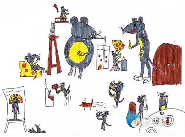 (“你瞧,老鼠王国里,老鼠们各司其职,好不悠闲自在!这张画不仅内容有趣,而且用色精简,角色位置错落有致……“菜菜老师点评。)