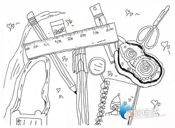 (这个孩子画的就是日常学习的文具,但组合构图大胆和锋芒!画纸背后的女孩敏感而自卑……但那是曾经了,现在她说,“就像黑暗里走了很久,找到了出口。”)
