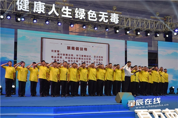 (6月26日上午,“健康人生,绿色无毒” 长沙百万市民禁毒签名仪式在长沙县三一工业城体育馆举行。)