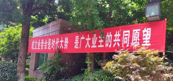 (新城新世界小区里四处悬挂宣传横幅,希望早日成立业委会。)