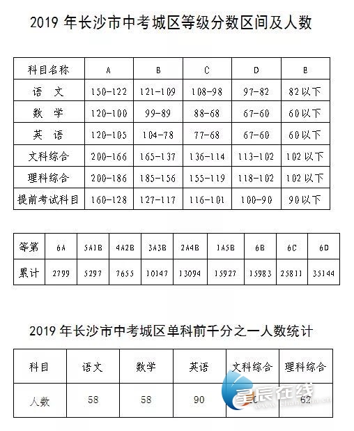 星辰在线7月2日讯(星辰全媒体记者 李楠 通讯员 黄军山)7月2日晚,2019年长沙中考成绩公布。随后,长沙市教育局发布了2019年长沙市中考城区等级分数区间及人数,其中6A考生有2799人。与此同时,长沙中考文化成绩单科前千分之一考生名单也一起公布。具体如下: