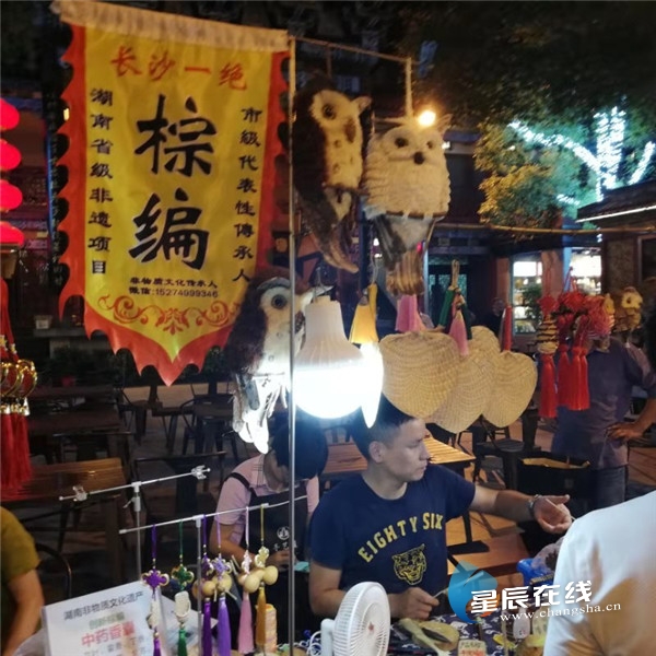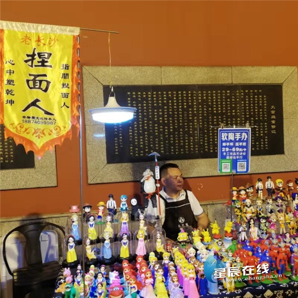 一进入坡子街,便置身在高兴吃喝玩乐的人群之中,熙熙攘攘、热热闹闹,使自己已不觉得炎热。这里人热盖过了暑热,也可能是由于坡子街临近湘江,这河风吹进了此街道的原故。进到火宫殿后,虽说楼馆里依然人声鼎沸,但让我马上有兴趣的是楼下的景观。在楼下前坪戏台前,一排亮着灯光、挂着“火宫殿”名号的“吹糖人”、“捏面人”、“铝编”、“棕编”、“剪纸”、“手绘脸谱”、“水晶刻字”、“现塑人像”等红幡旗的民间手工艺摊位,围观者众多,看来男女老少大家都很感兴趣。