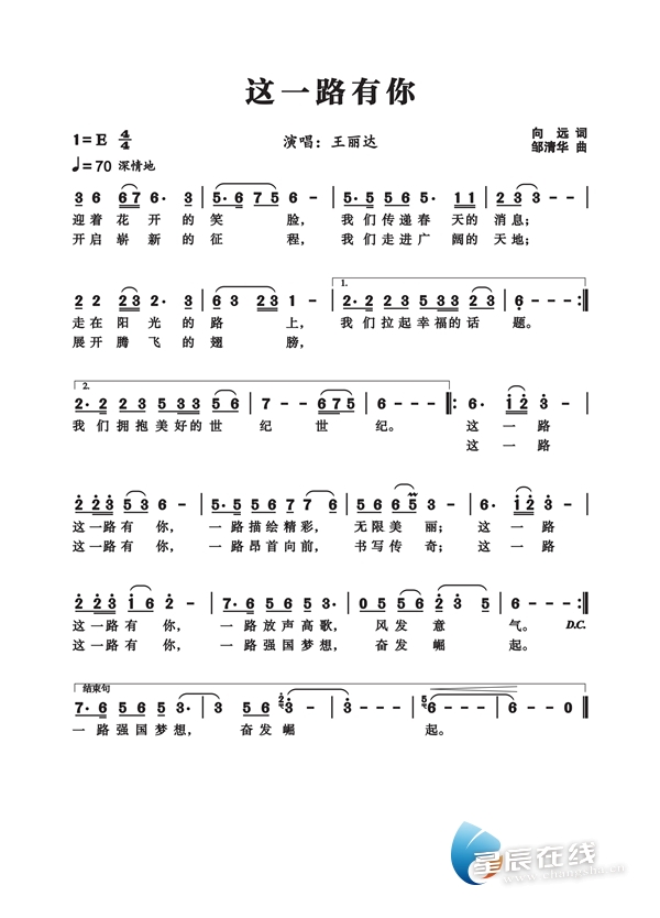 星辰在线9月26日讯(星辰全媒体记者 刘佳)向祖国深情表白,为时代放声高歌。为庆祝中华人民共和国成立70周年,表达心中无限的爱国热情,日前,由湖南省歌剧院出品,著名歌唱家王丽达演唱、向远作词、邹清华作曲的歌曲《这一路有你》正式向社会推出。该歌曲以朴实的歌词描绘了这些年来国家逐步腾飞的历史轨迹,以优美大气的旋律唱出“这一路”的无限美好。