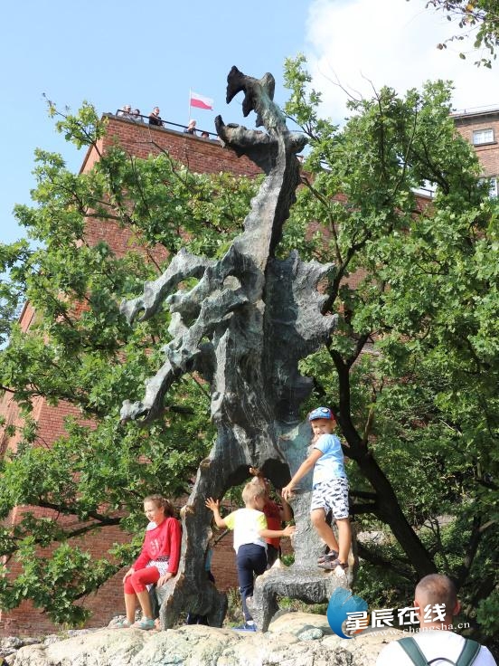 (瓦维尔城堡下方的喷火龙青铜雕像。)