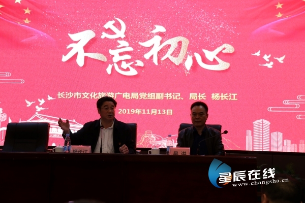 在主题党课上,长沙市文化旅游广电局党组副书记、局长杨长江以“不忘初心、牢记使命,争做省会文化和旅游事业繁荣兴盛的守卫者”为题,为全体人员带来一场丰盛的政治大餐。杨长江在授课中指出,要强化初心使命的担当,奏响时代发展的强音;要高举理想信念的火炬,绘就文旅融合的蓝图;要树立执法为民的榜样,凝聚改革发展的合力。
