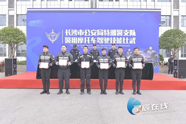 据悉,此次摩托车驾驶技能比武不仅是长沙特警首次举办,在湖南省所有特警队伍中也是首次开展,比武共分为圆桩绕行、通过独木桥、绕直线柱(慢桩)、绕直线柱(快桩)、快速起步停车等5个科目,是长沙特警根据实际警情处置需要自主创新的考核科目,目的在于进一步提高特警队员在处置突发性事件时的快速反应能力。长沙特警全体参赛民警在比赛前开展了高强度的集中训练, 每一个科目细节都被反复训练,只为在比赛中、在实战中能够提高1秒。据悉,比武所用的摩托车为长沙特警最新采购的大马力重型摩托车,全车质量200余公斤、排量250ml、车长2.145米,驾驶此类重型摩托要完成多种驾驶技能测试,难度可想而知。经过一个上午的激烈比拼,最终,特警一组民警牟钊锋夺得了个人全能第一名,特警四组市政府快警平台夺得团体第一名。