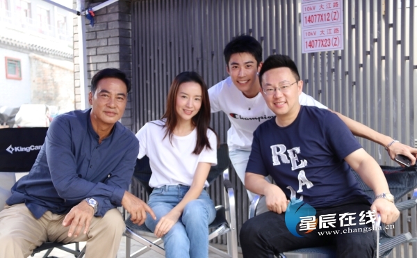 (《澳门人家》总编剧、湖南伢子梁振华<右一>与该剧主演任达华<左一>、董洁<左二>、冉旭<右二>。)