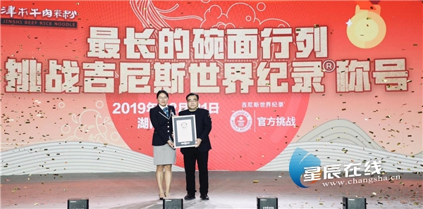 (吉尼斯世界纪录认证官熊文颁发“最长的碗面行列”吉尼斯世界纪录称号)