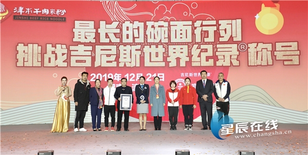 星辰在线12月21日讯(通讯员 雷小浩) “在此请允许我很荣幸的代表吉尼斯世界纪录宣布:由津市牛肉米粉协会于2019年12月21日在中国湖南省常德市津市组织进行的‘最长的碗面行列’吉尼斯世界纪录称号挑战中,最终形成的行列碗面数量为3988碗,打破了3720碗的当前记录,挑战成功!诞生了新的吉尼斯世界纪录,祝贺!”吉尼斯世界纪录认证官熊文发布。