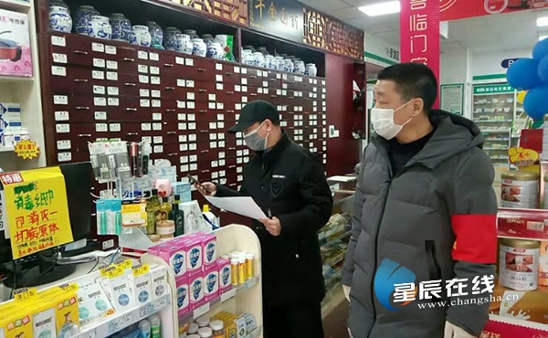 (社区工作人员在药房检查。)
