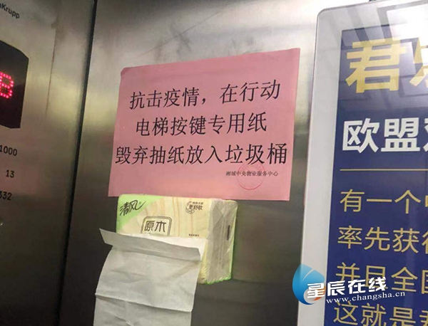 “抗击疫情,在行动,请用电梯按键专用纸”这样一张温馨提示在湘域中央小区每个电梯间都可以看见。由于湘域中央在长沙市中心地段,是一个成熟的中心区域,住户和商户众多,由于假期即将结束,返程的人员和商户陆陆续续准备开业,长沙景鹏物业管理有限公司立即加强了防疫管控措施,自2月1日开始,除了日常防疫工作之外,特别加强对电梯间的消毒频次,同时对各单元门把手、电梯按钮等重点区域加封了保护膜,同时在电梯内安放了抽纸,并且贴出温馨提示,这看似很小的举动却温暖了许多业主的心。