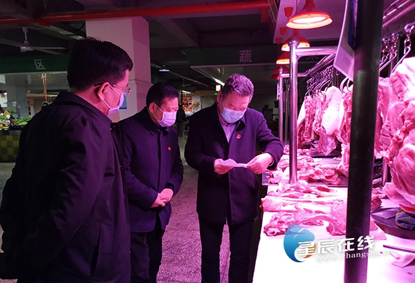 (芙蓉区市场监管局党委书记、局长陈洪林在农贸市场检查经营户的检验证明和疫情防控措施落实情况。)