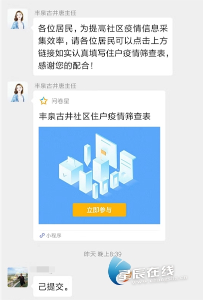 星辰在线2月7日讯(通讯员 唐可 杨天龙) “各位居民,为提高社区疫情信息采集效率,请各位居民可以点击上方链接如实认真填写住户疫情筛查表,感谢您的配合!”2月5日晚,由一条长沙市芙蓉区定王台街道丰泉古井社区主任所发的信息,出现在社区内各个大微信群内。